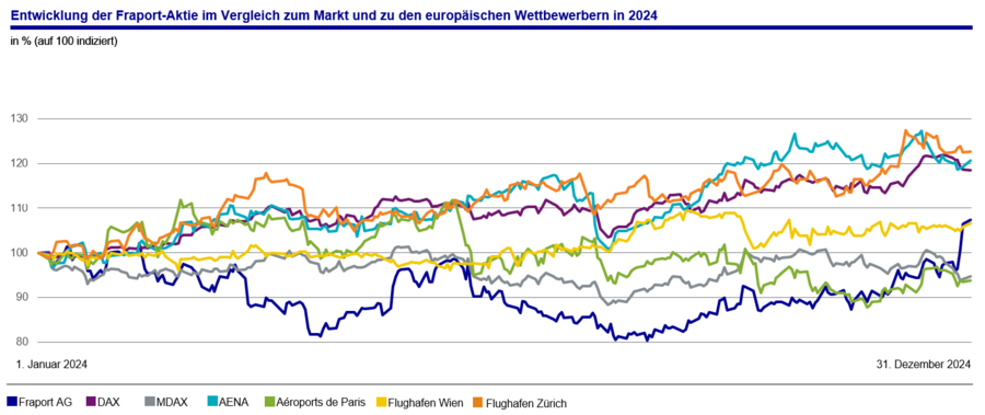 Die Aktien der weiteren börsengelisteten europäischen Flughäfen wiesen im Jahr 2024 folgende Entwicklungen auf: AENA +20,1 %, Aéroports de Paris –5,7 %, Flughafen Wien +5,8 % und Flughafen Zürich +23,9 %.